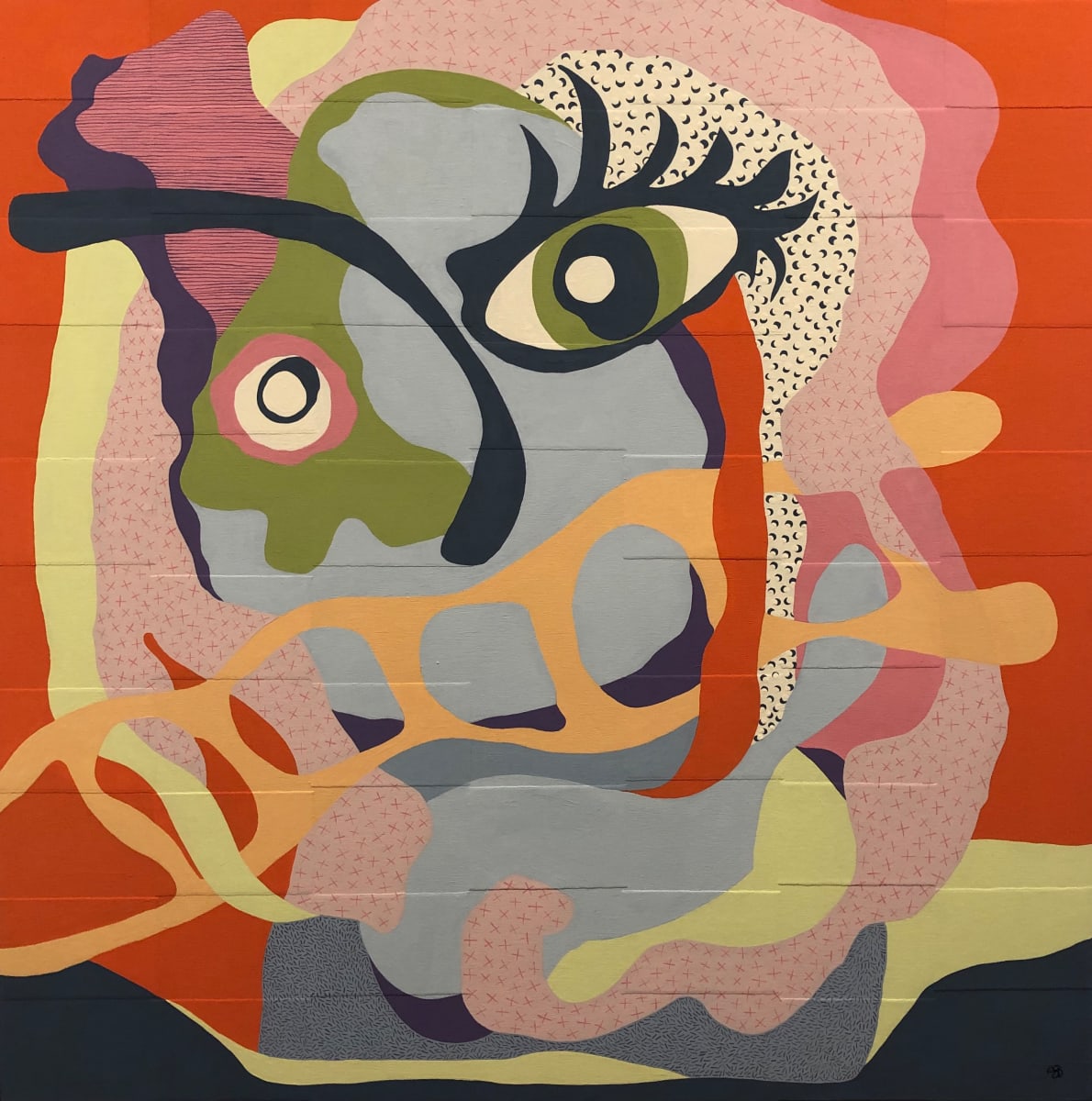 In this series I combine faces or characters, household objects that are seen or implied, and flat areas of color juxtaposed with repeat painted patterns over collage. The deliberate creation of detailed patterns represents repetitive labor that goes under-appreciated and often unpaid and harks to the handy work of women. The collage grids that create the base surface for the art represent social norms and on each painting the grid is broken in areas suggesting room for new ideas and social structures. My initial inspiration for this body of work came from the insides of security envelopes—a product that is designed as protection for the contents within and actuality obliterates meaning and message, saying nothing (until ripped open).