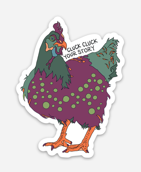 Cluck Cluck Chicken is telling you to cluck out your Tender Story© because your stories matter. She is part of a collection of animals with a message to share. That the voices and stories of women and marginalized people are the best path to change and a social structure that can support more humanity.