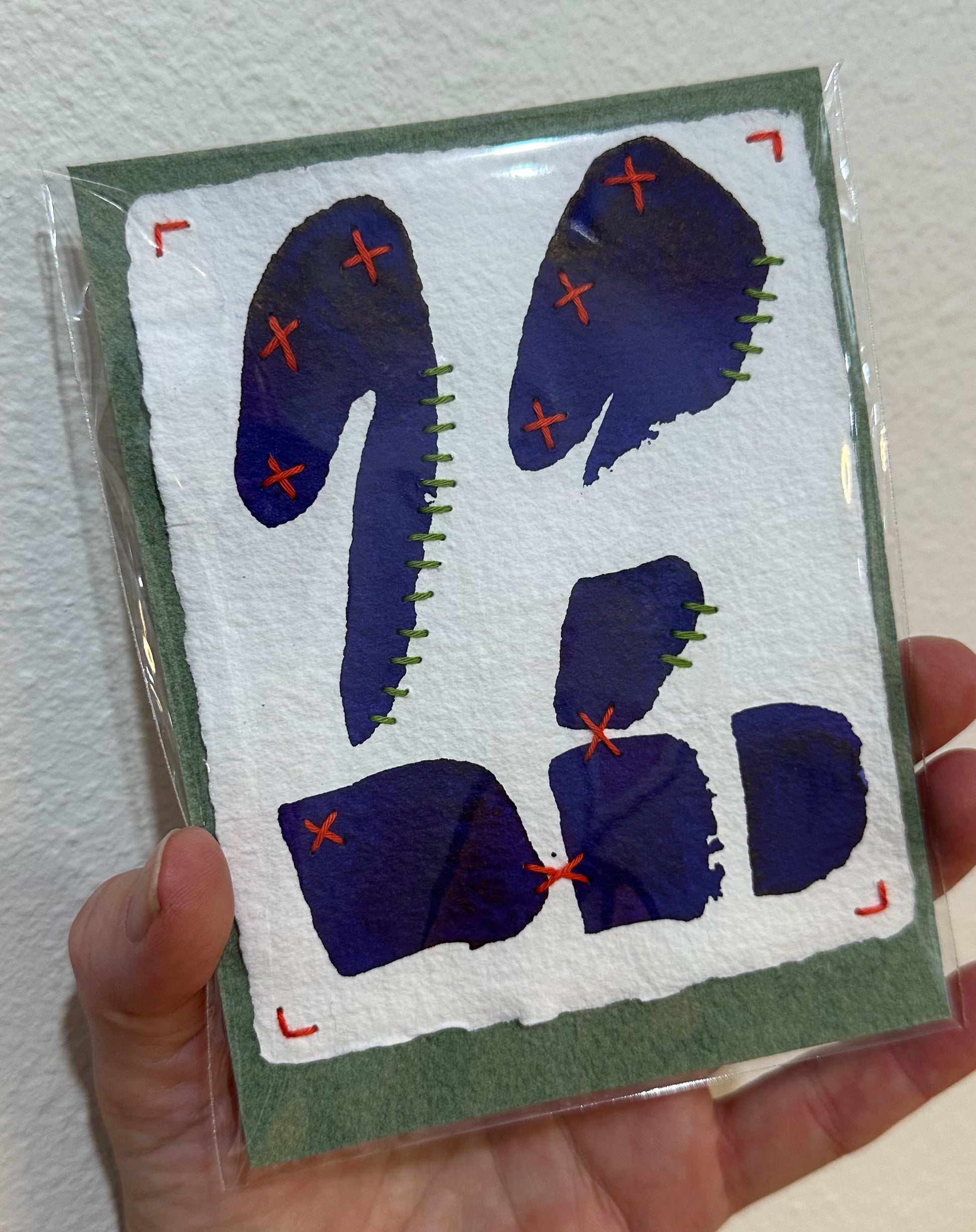 Stitch & So #18 Under Question, 2024, Watercolor, Flashe Paint, Sashiko Thread, on paper. Collage Painting. One in a series of paintings called the Stitch & So Series. Original Art.