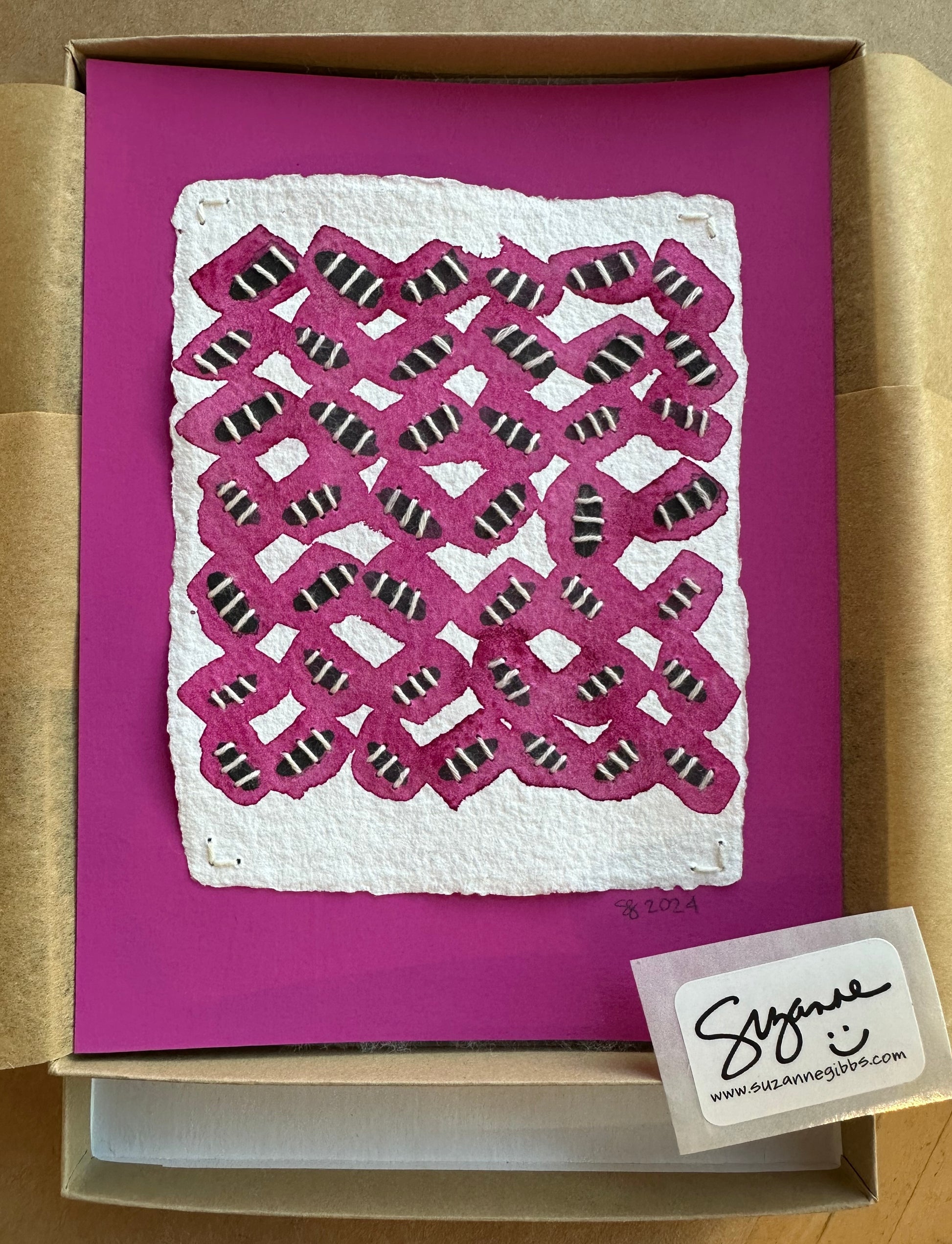 Stitch & So #25 Supervised Bugs, 2024, Watercolor, Flashe Paint, Sashiko Thread, on paper. Collage Painting. One in a series of paintings called the Stitch & So Series. Original Art.