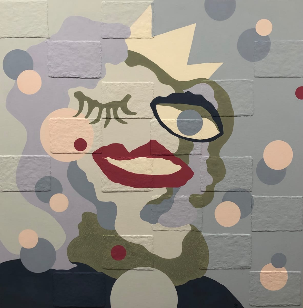 In this series I combine faces or characters, household objects that are seen or implied, and flat areas of color juxtaposed with repeat painted patterns over collage. The deliberate creation of detailed patterns represents repetitive labor that goes under-appreciated and often unpaid and harks to the handy work of women. The collage grids that create the base surface for the art represent social norms and on each painting the grid is broken in areas suggesting room for new ideas and social structures. My initial inspiration for this body of work came from the insides of security envelopes—a product that is designed as protection for the contents within and actuality obliterates meaning and message, saying nothing (until ripped open).