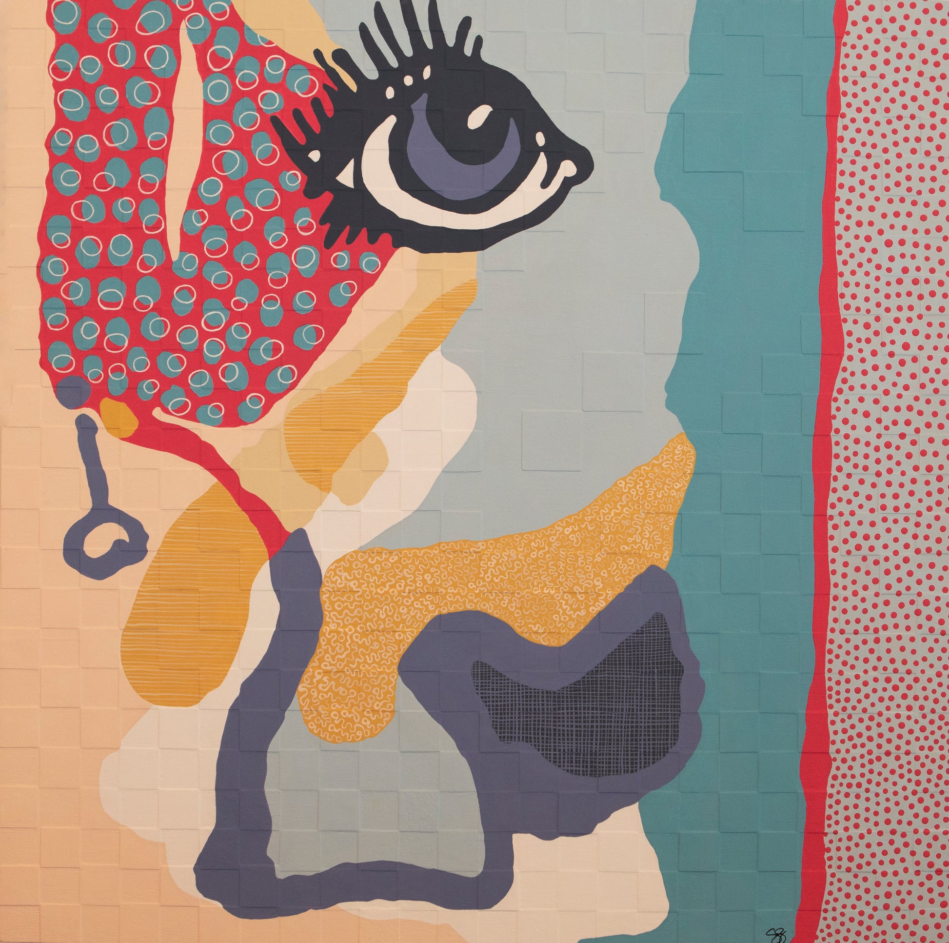 In this series I combine faces or characters, household objects that are seen or implied, and flat areas of color juxtaposed with repeat painted patterns over collage. The deliberate creation of detailed patterns represents repetitive labor that goes under-appreciated and often unpaid and harks to the handy work of women. The collage grids that create the base surface for the art represent social norms and on each painting the grid is broken in areas suggesting room for new ideas and social structures. My initial inspiration for this body of work came from the insides of security envelopes—a product that is designed as protection for the contents within and actuality obliterates meaning and message, saying nothing (until ripped open).