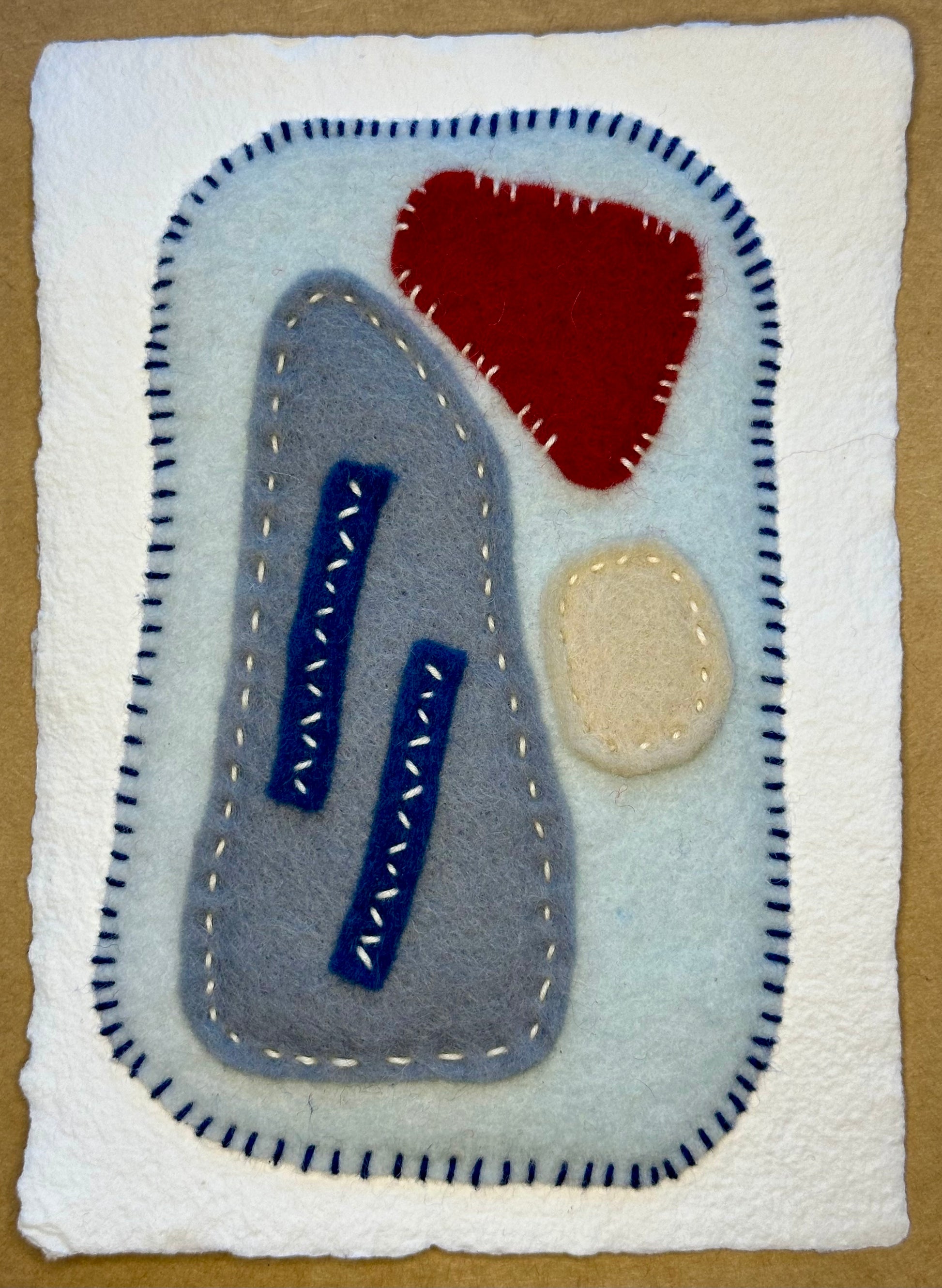 Happy Scrappy #20, 2024, Felt & Sashiko Thread on Handcrafted Paper. 6 1/2 x 4 1/2 inches.