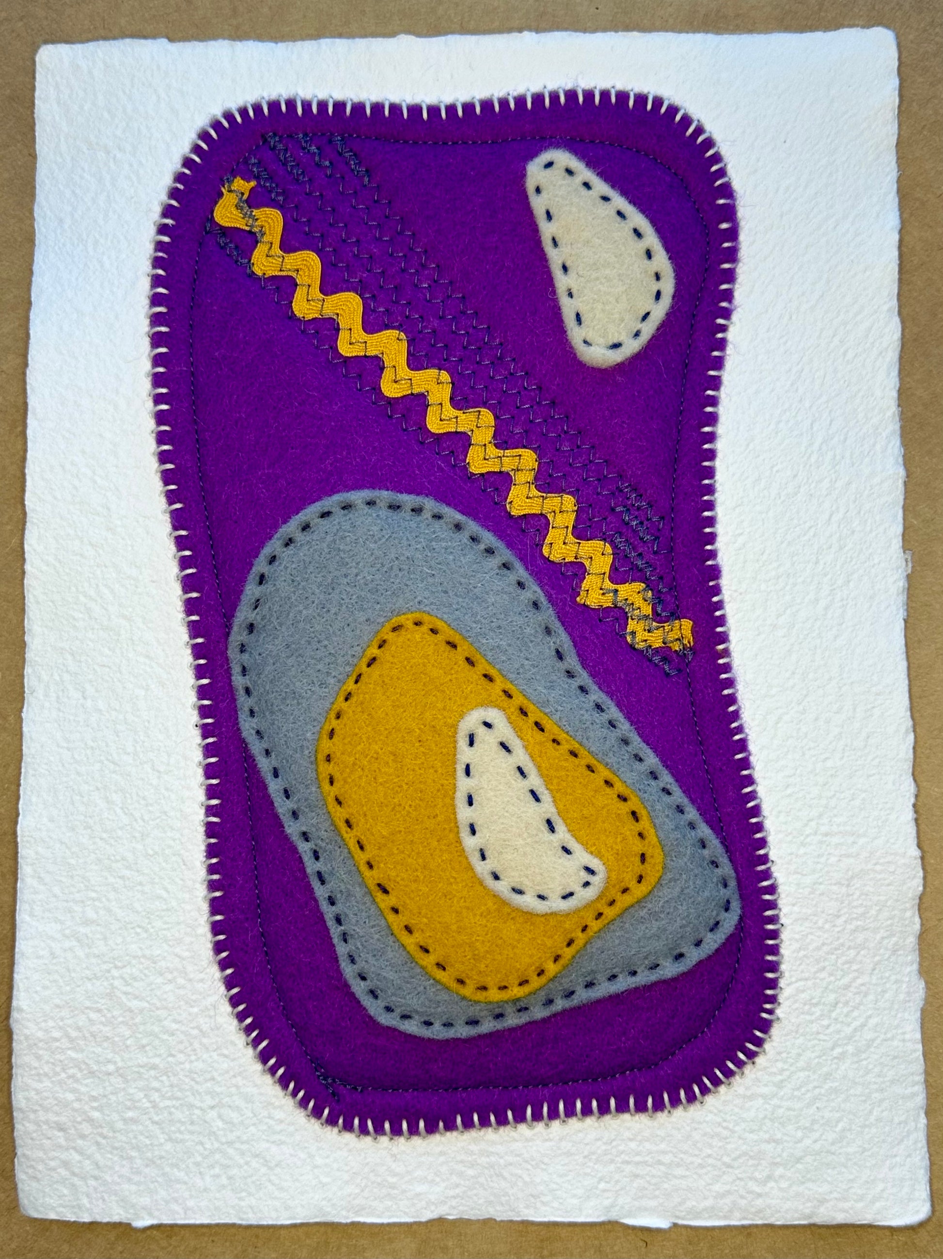 Happy Scrappy #21, 2024, Felt, Rikrack & Sashiko Thread on Handcrafted Paper. 9 1/2 x 7 inches.