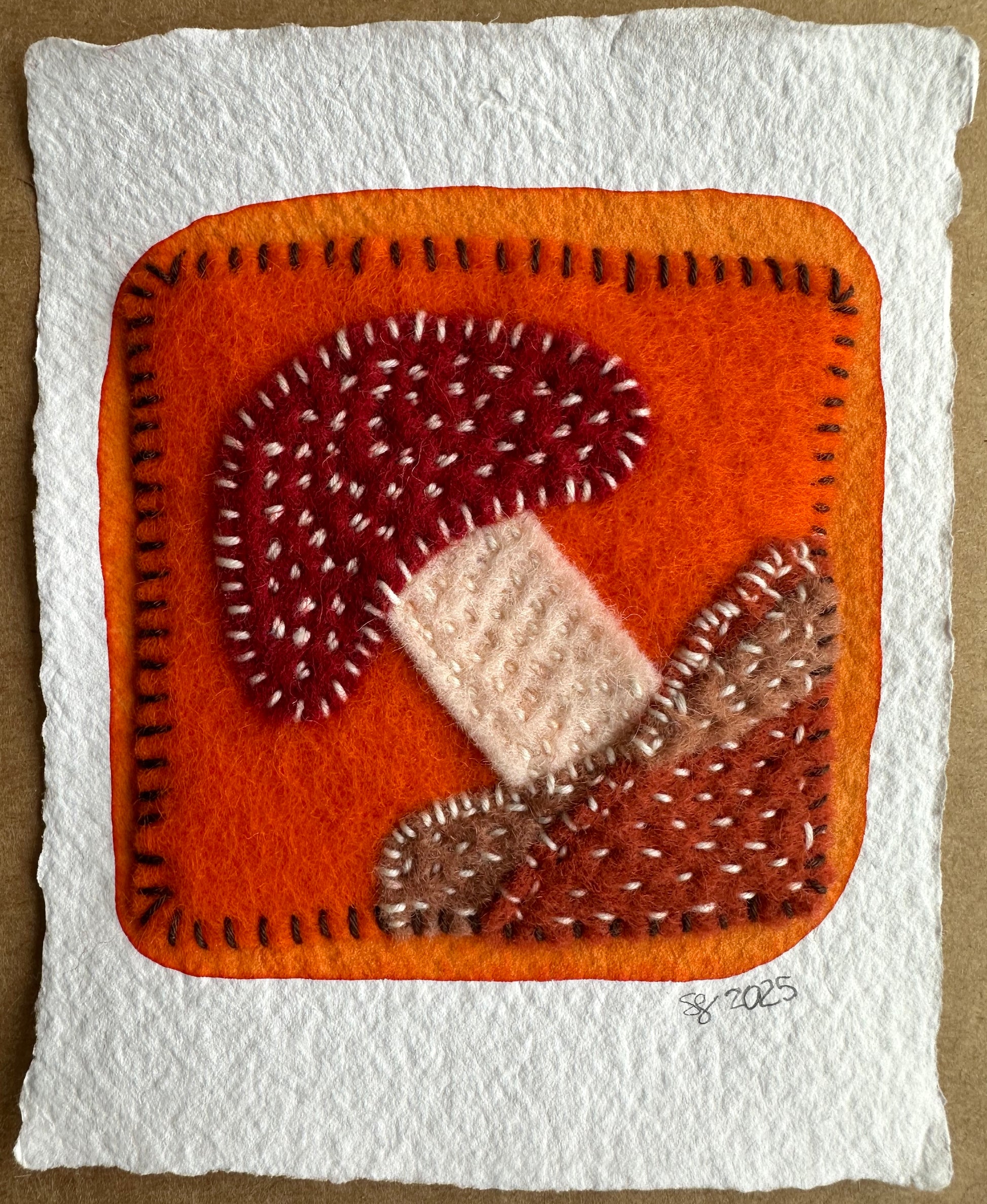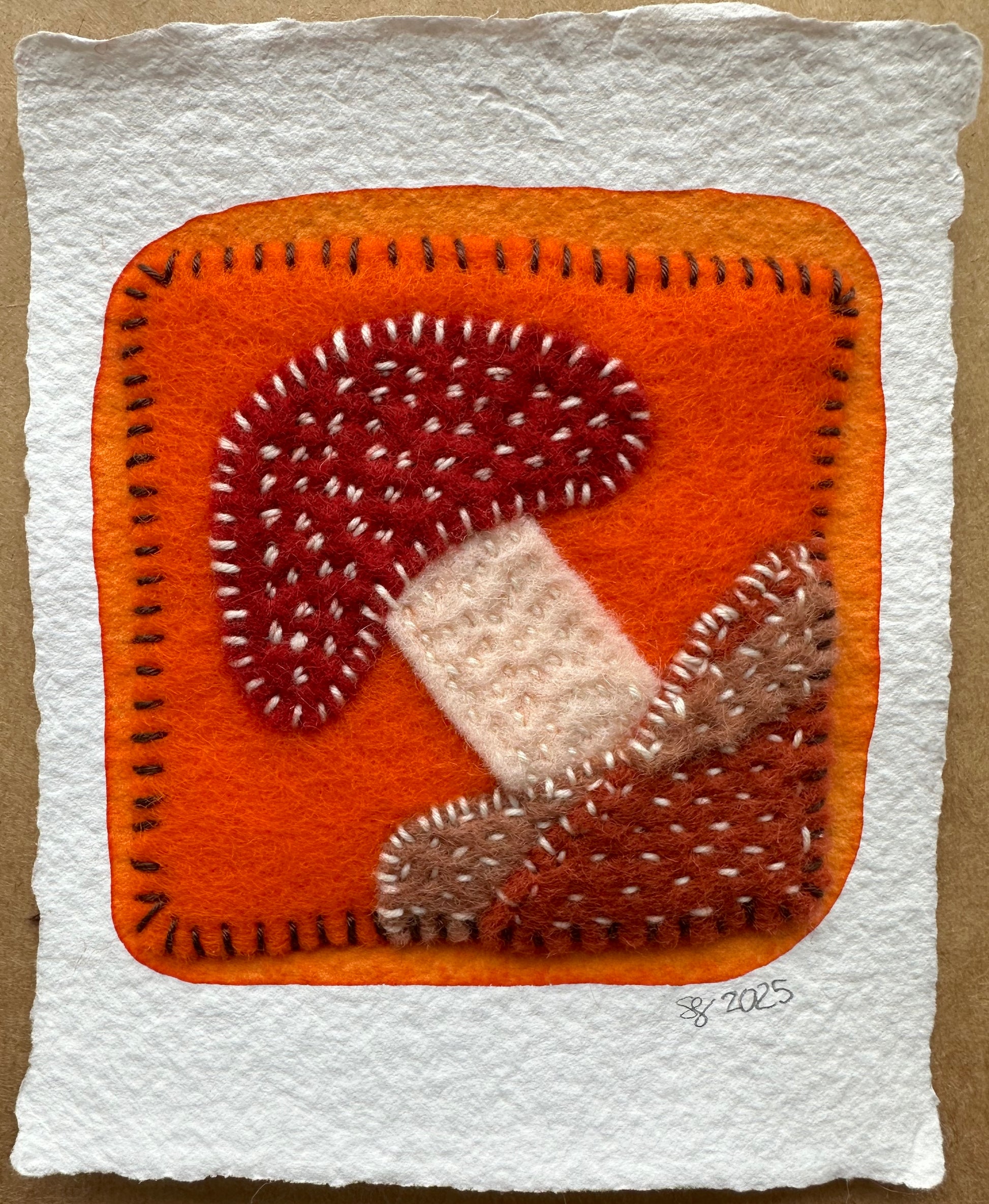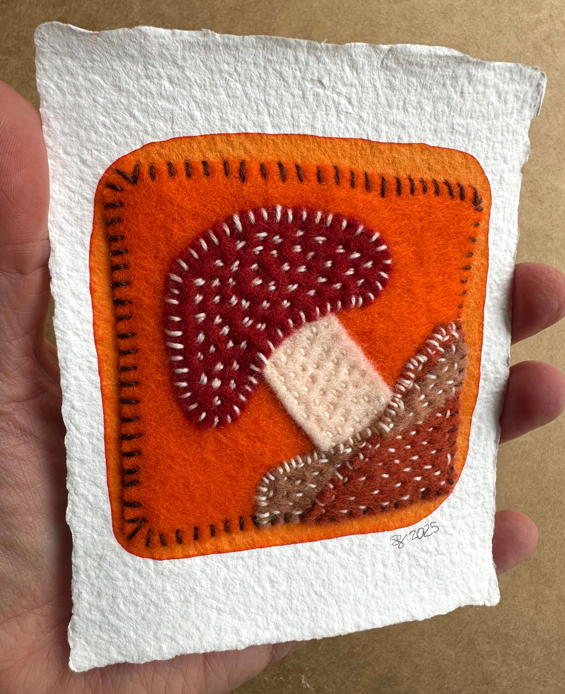 Happy Scrappy #25, Mushroom, 2025, Felt & Sashiko Thread on Handcrafted Paper. 5 x 4 inches.