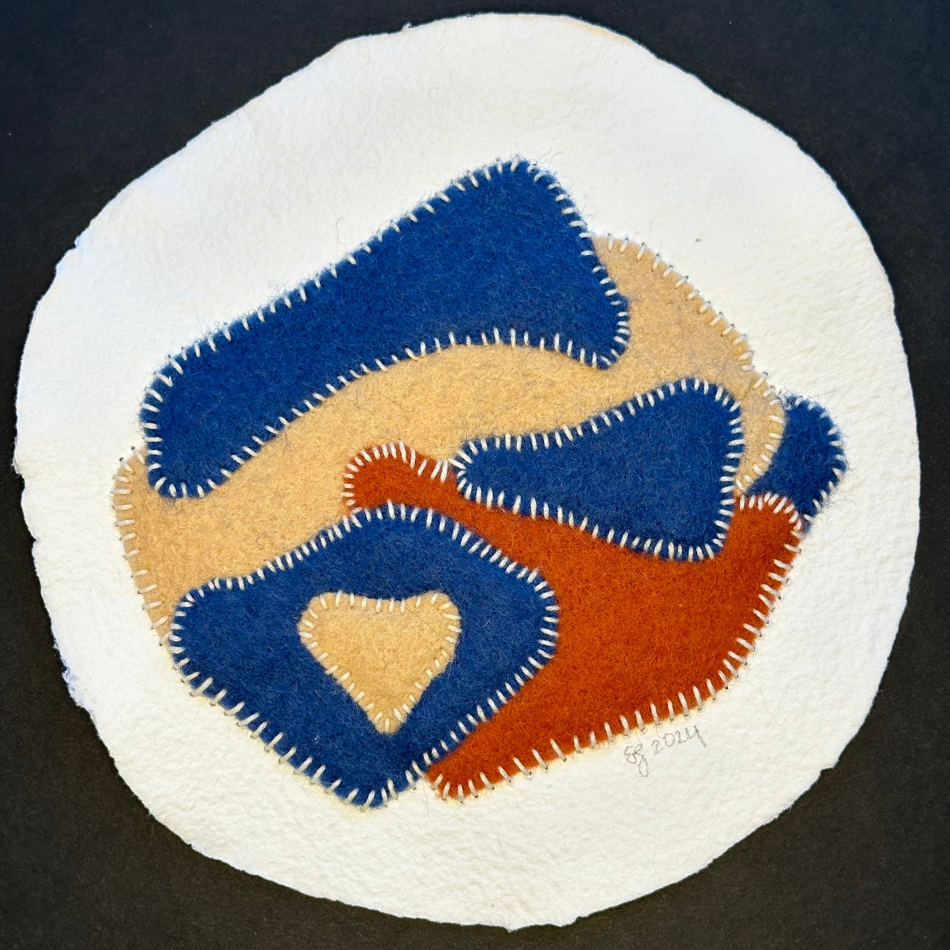 Happy Scrappy #8, 2024, Felt & Sashiko Thread on Handcrafted Paper. 6 inches round.