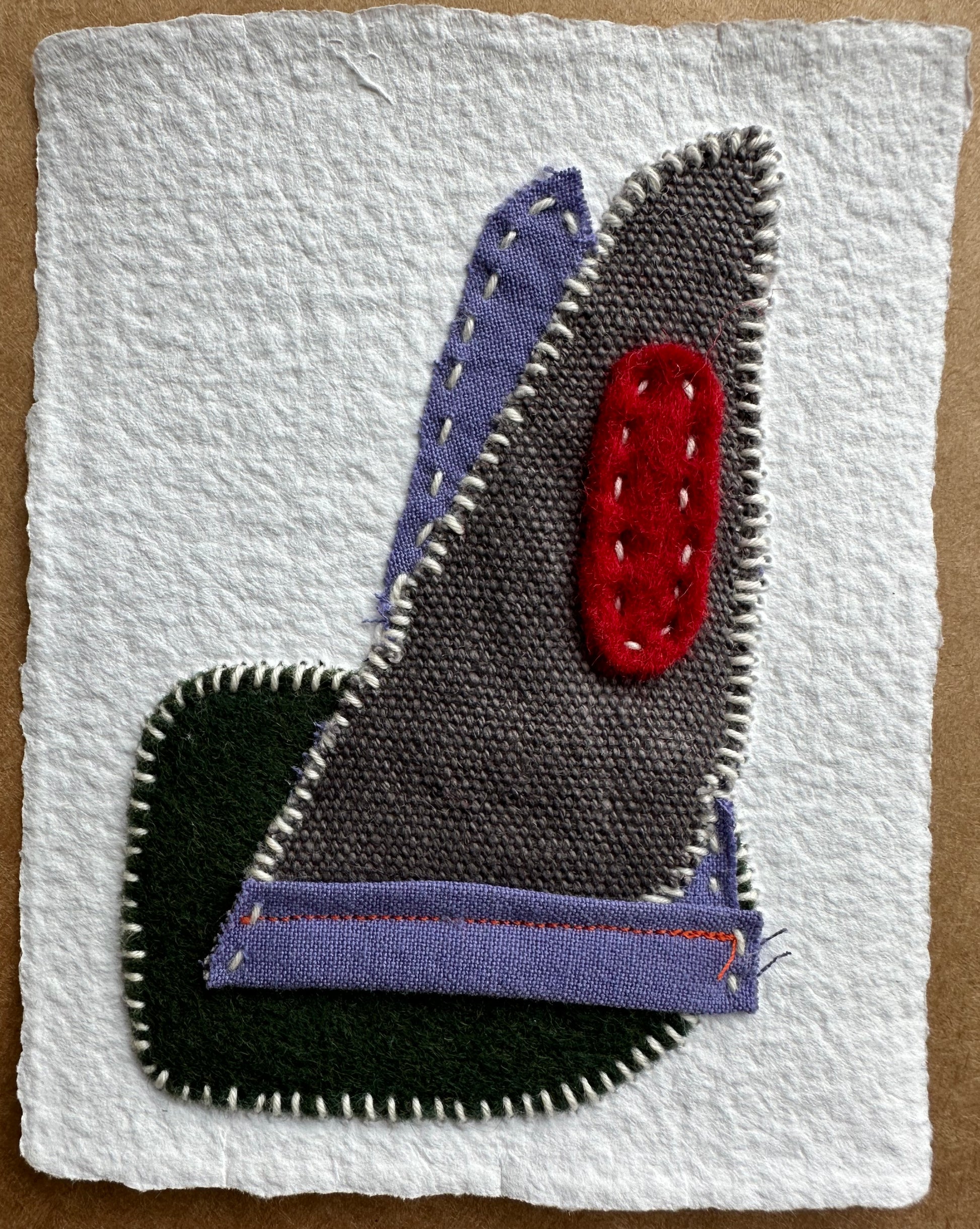 Happy Scrappy #13, 2024, Felt, Fabric, & Sashiko Thread on Handcrafted Paper. 5 x 4 inches.