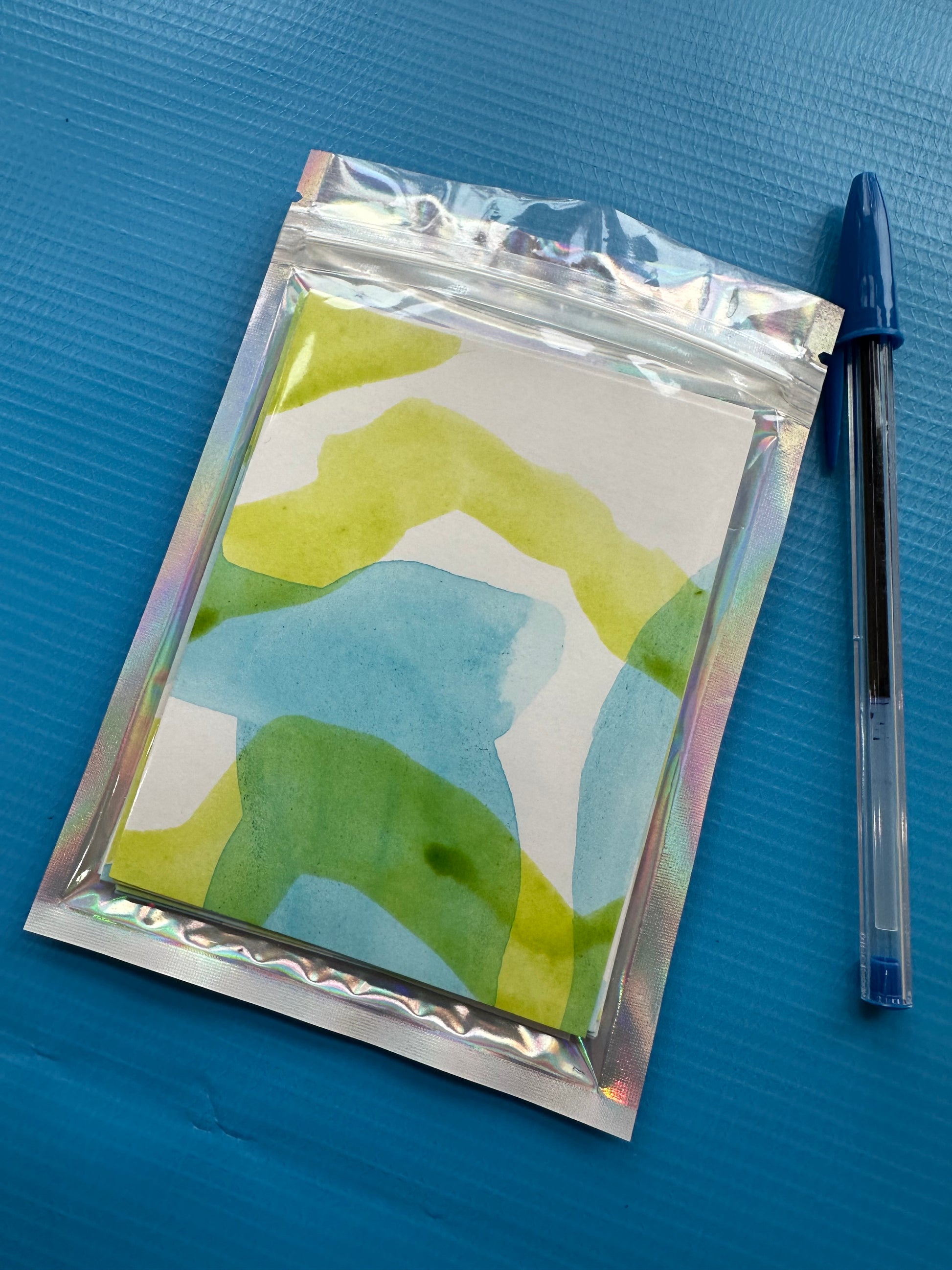 Each piece of paper is gently colored with a lime green & blue ink and watercolor wash. A little Sketchbook in it's own little bag.