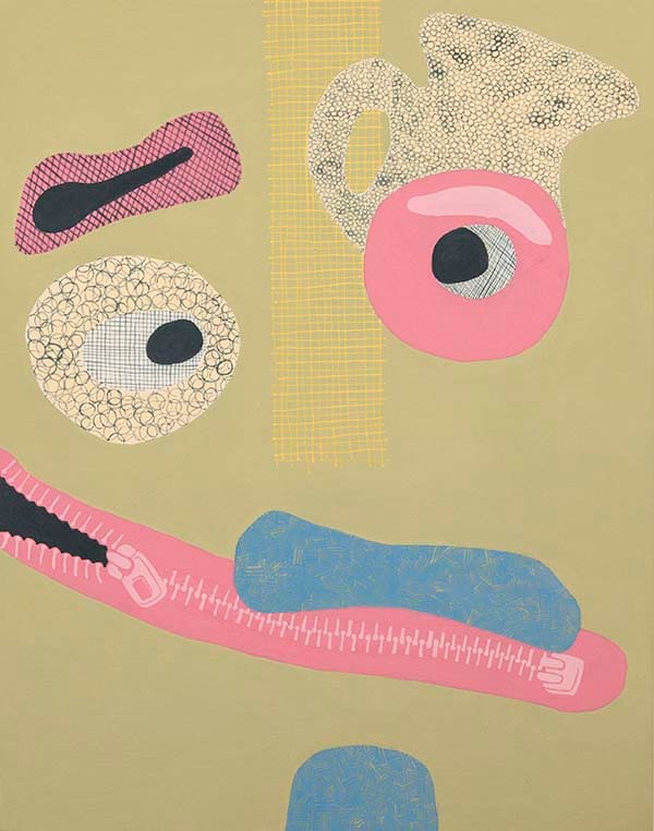 In this series I combine faces or characters, household objects that are seen or implied, and flat areas of color juxtaposed with repeat painted patterns over collage. The deliberate creation of detailed patterns represents repetitive labor that goes under-appreciated and often unpaid and harks to the handy work of women. The collage grids that create the base surface for the art represent social norms and on each painting the grid is broken in areas suggesting room for new ideas and social structures. My initial inspiration for this body of work came from the insides of security envelopes—a product that is designed as protection for the contents within and actuality obliterates meaning and message, saying nothing (until ripped open).