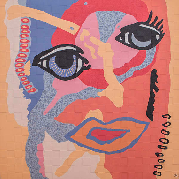 In this series I combine faces or characters, household objects that are seen or implied, and flat areas of color juxtaposed with repeat painted patterns over collage. The deliberate creation of detailed patterns represents repetitive labor that goes under-appreciated and often unpaid and harks to the handy work of women. The collage grids that create the base surface for the art represent social norms and on each painting the grid is broken in areas suggesting room for new ideas and social structures. My initial inspiration for this body of work came from the insides of security envelopes—a product that is designed as protection for the contents within and actuality obliterates meaning and message, saying nothing (until ripped open).