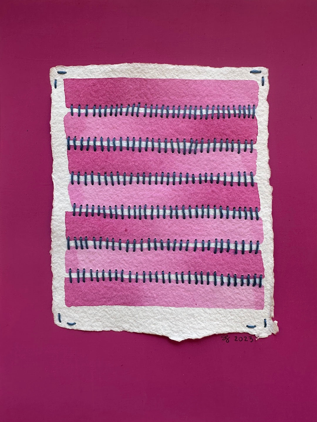 Stitch & So #2 Barbie, 2023, Watercolor, Flashe Paint, Sashiko Thread, on paper. Collage Painting. One in a series of paintings called the Stitch & So Series. Original Art.